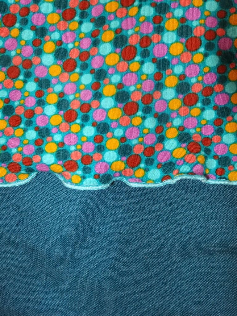 Top je podle dětského střihu z Ottobre, ale má větší výstřih i průrameníky, ta jejich největší dívčí velikost teda byla i na mě velká, tak mám radost, že mám do budoucna podle čeho tvořit. Výstřih a průrameníky jsou oblemované "na třetiny", no to teda byla zábava...
